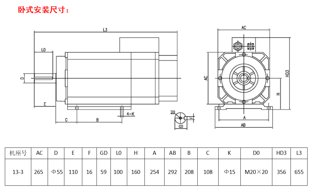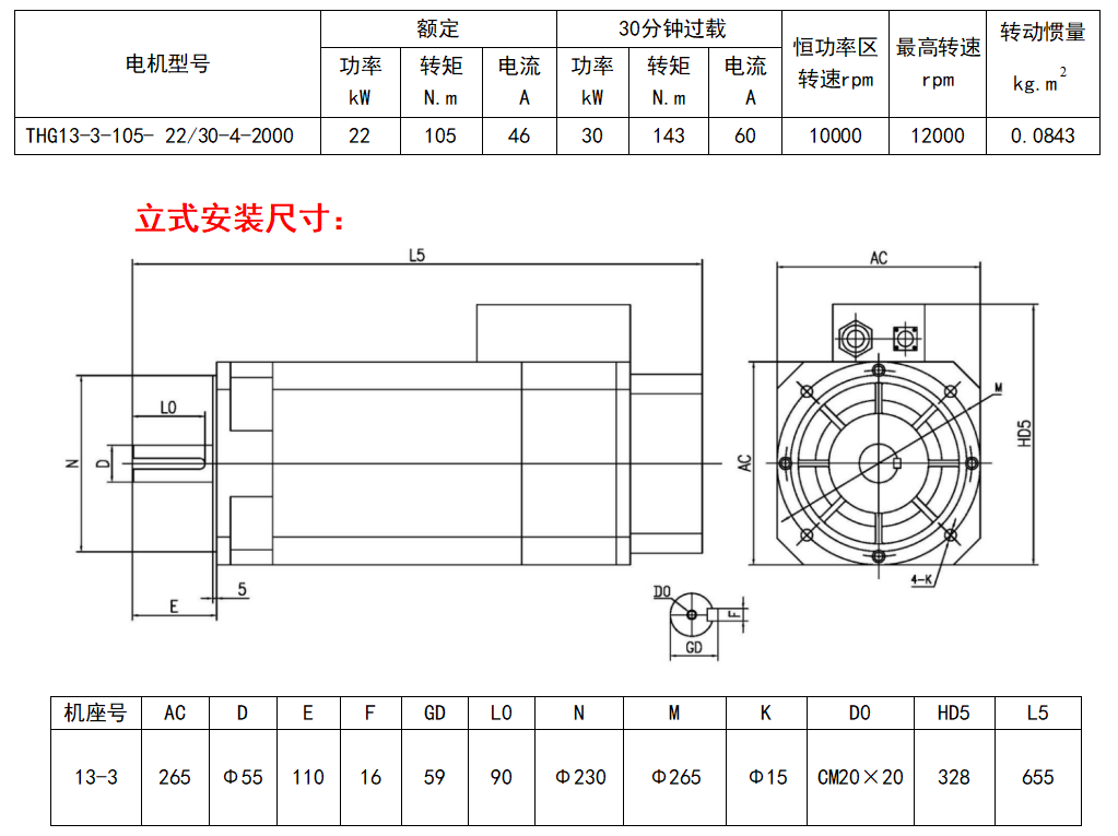 额定功率22KW伺服主轴电机额定电压380V基频67Hz基底转速2000r/min最高12000r/min安装尺寸选型如下: